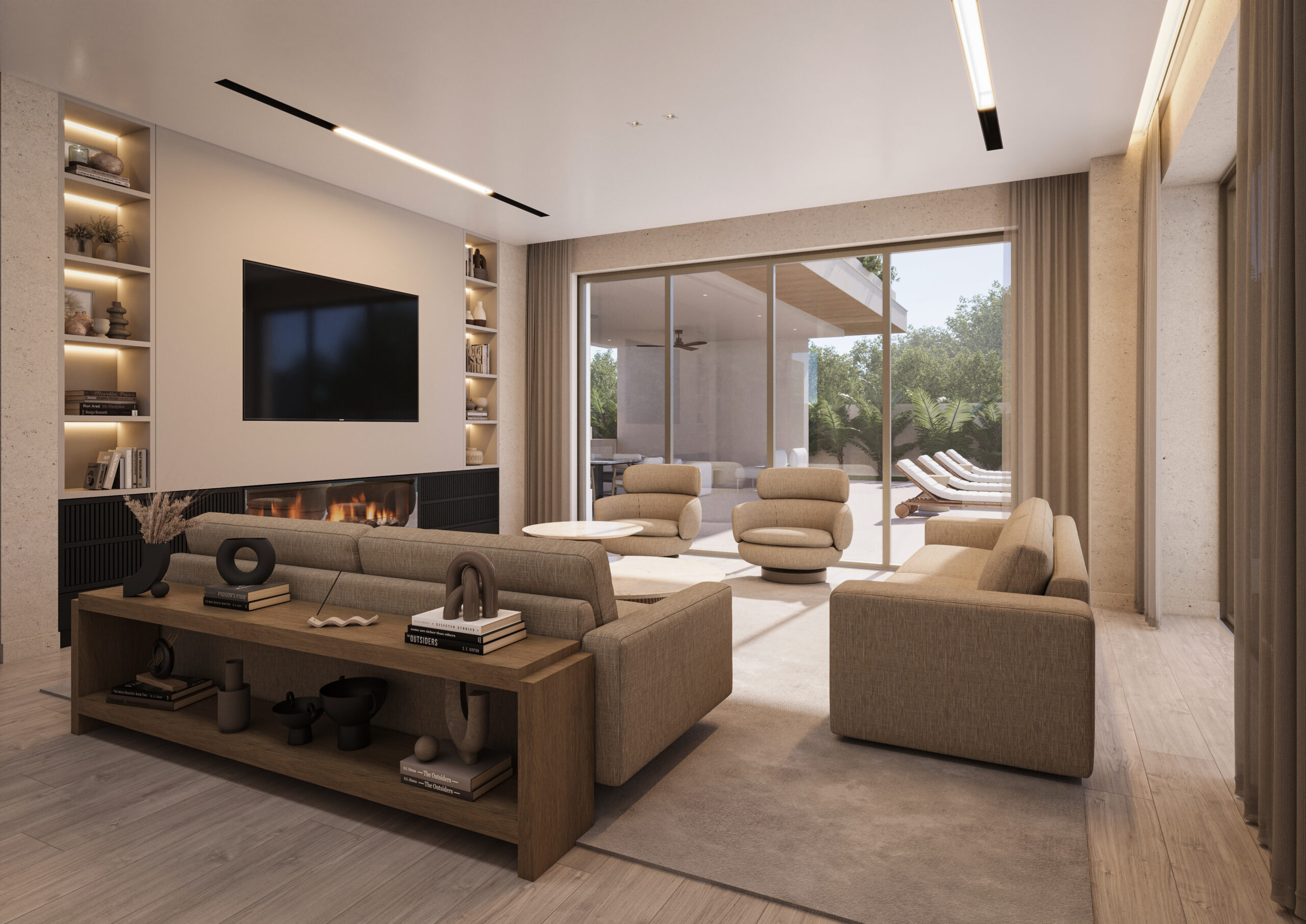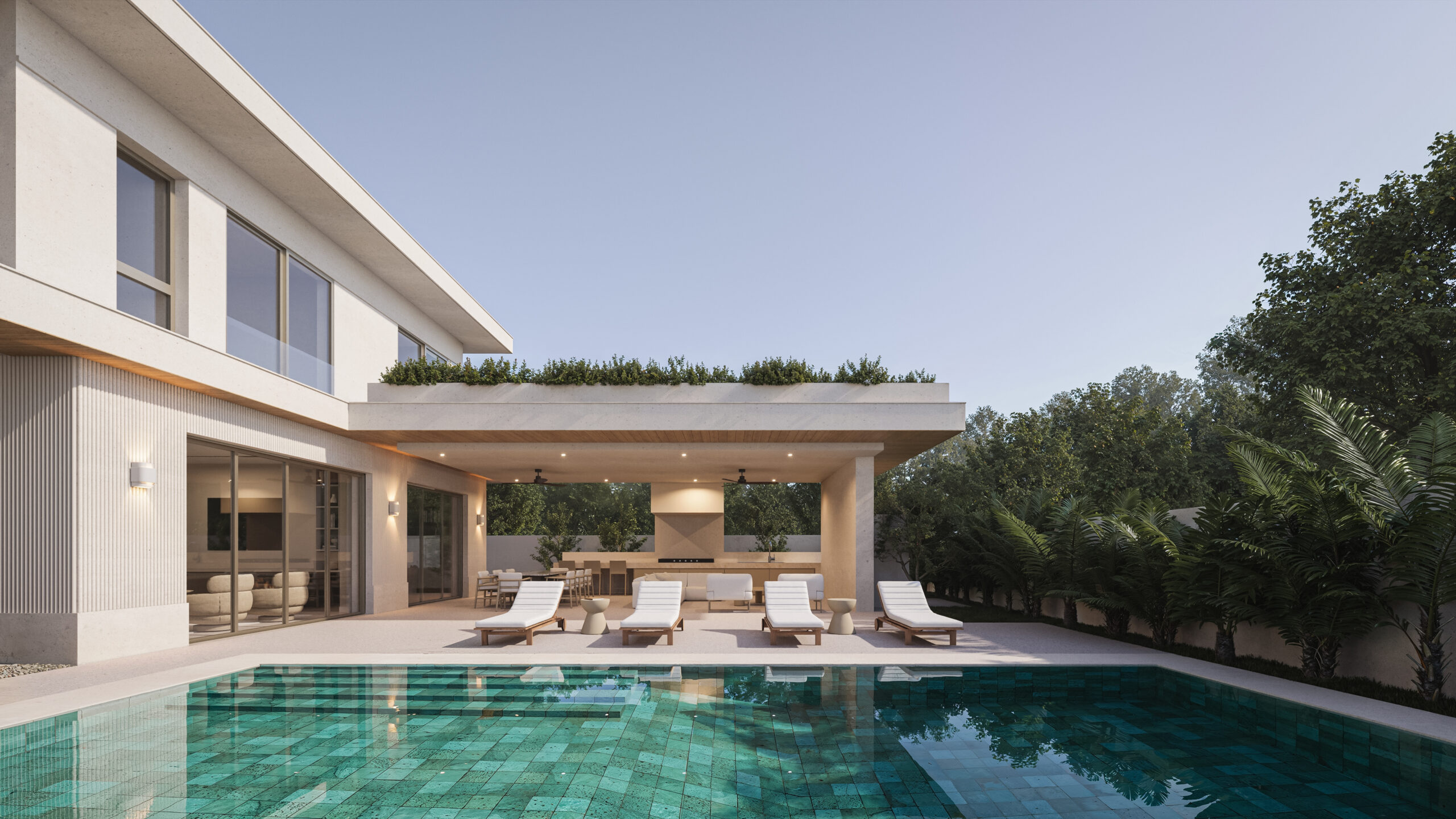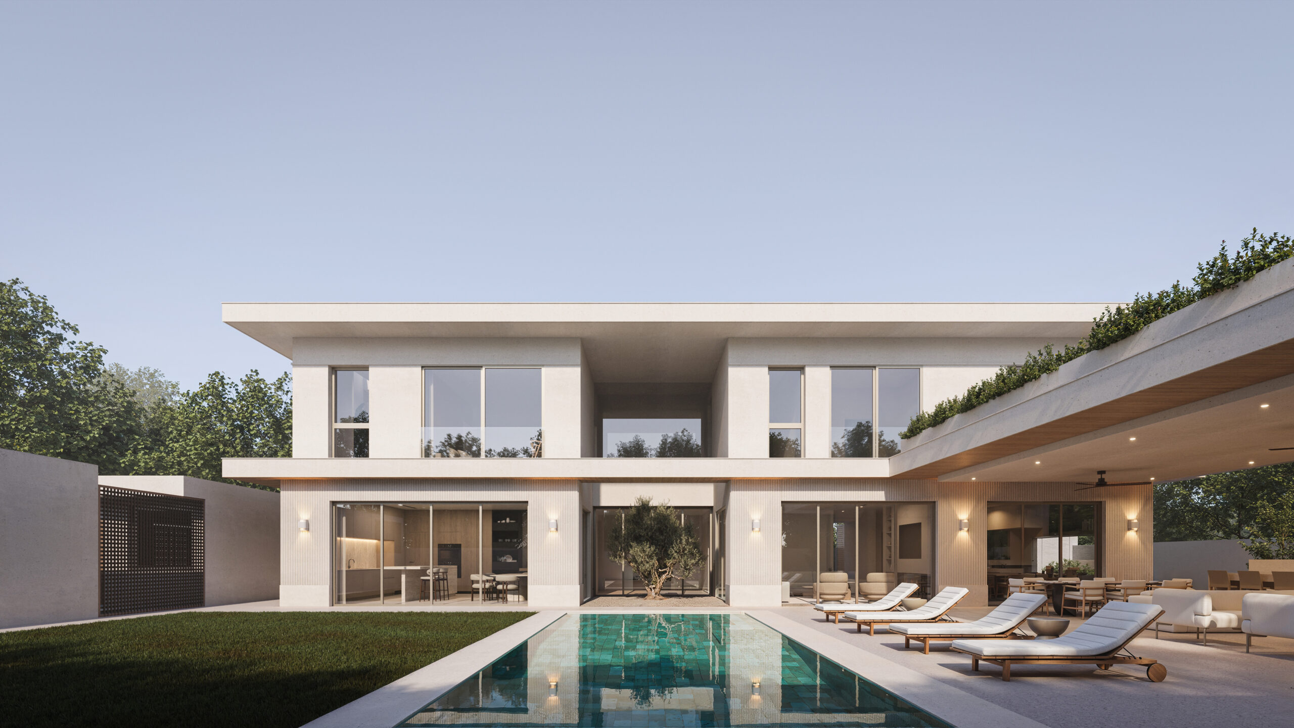 The design language of Olea House is one of intentional transparency. Expansive floor-to-ceiling glass facades dissolve the boundaries between the interior sanctuaries and the sculptural outdoor pool area. The structural form utilizes a cantilevered upper volume to provide natural shading, creating a rhythmic play of light and shadow throughout the day.